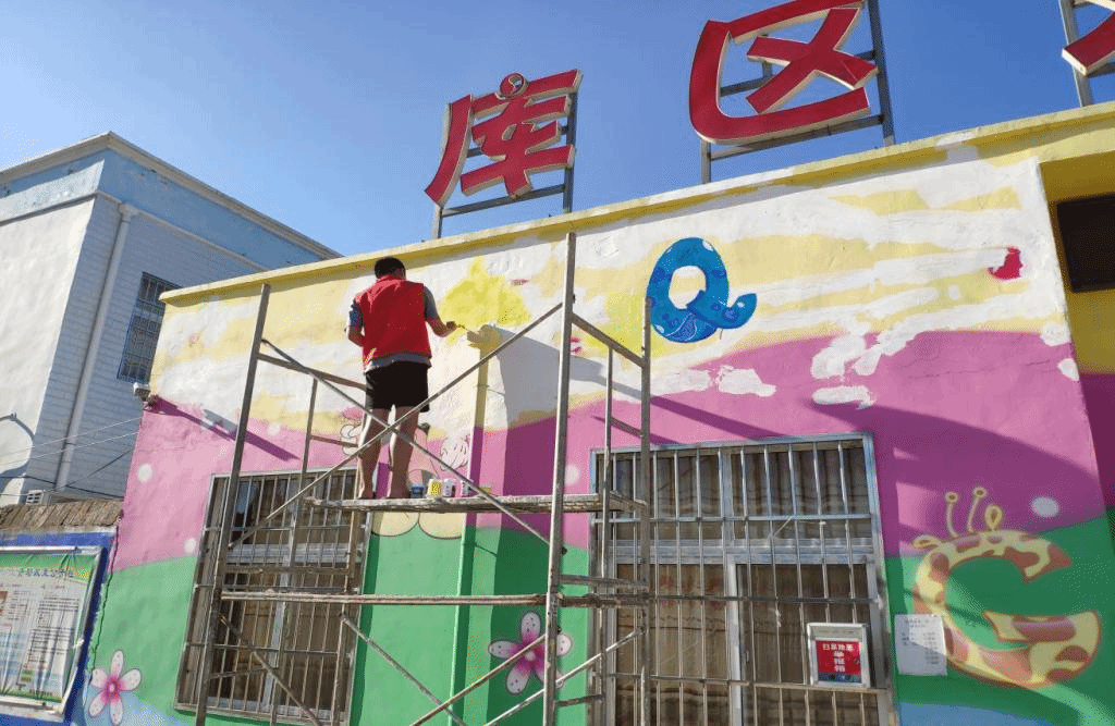 红色青春轻骑兵小分队队员在对搬走岭村幼儿园进行外墙修补