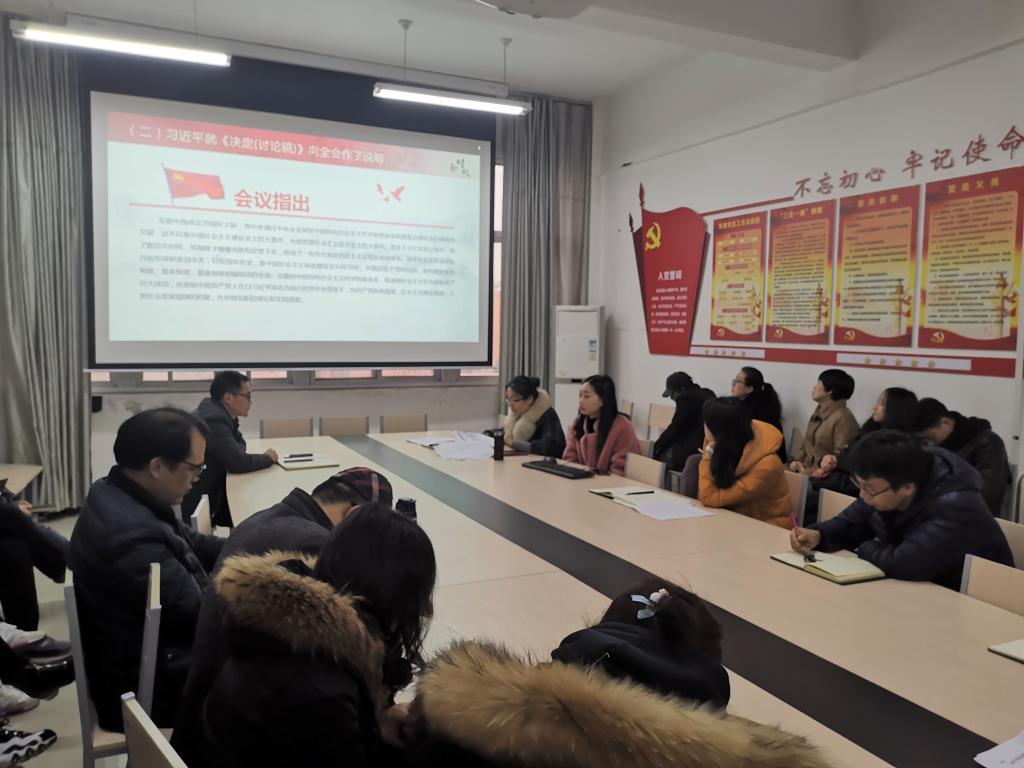 党总支副书记李阳从以下四方面进行了会议精神解读:一、十九届四中全会背景介绍;二、会议主要审议的内容;三、会议的要点亮点;四、重大会议的总体号召。深入阐述了中国特色社会主义制度和国家治理体系的显著优势,深入阐述了全会《决定》的总体要求、总体目标和重点任务及全面落实全会重大战略任务的要求。