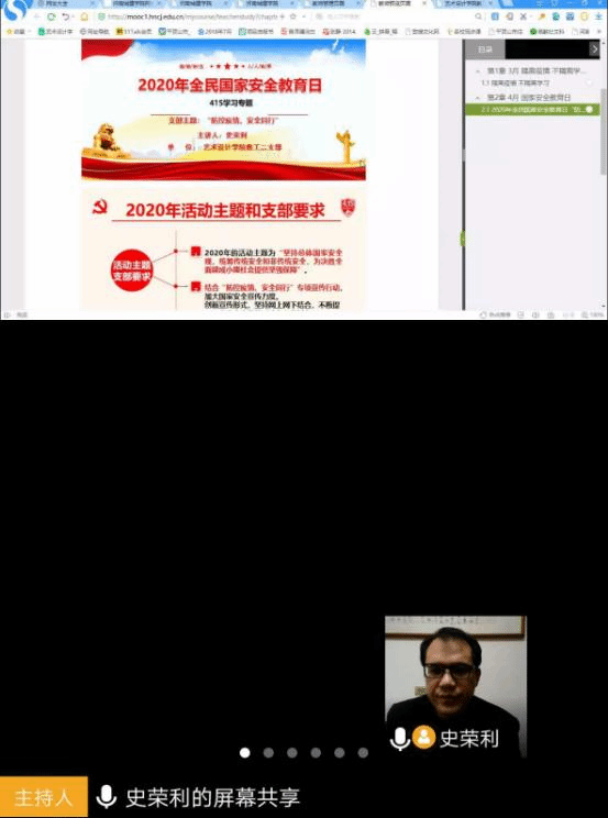 首先,支部书记史荣利同志发言:“我们要知道2020年的活动主题为“坚持总体国家安全观,统筹传统安全和非传统安全,为决胜全面建成小康社会提供坚强保障”;结合“防控疫情、安全同行”专项宣传行动,加大国家安全宣传力度。创新宣传形式,坚持网上网下结合,不断提高国家安全宣传的影响力和传播力。”