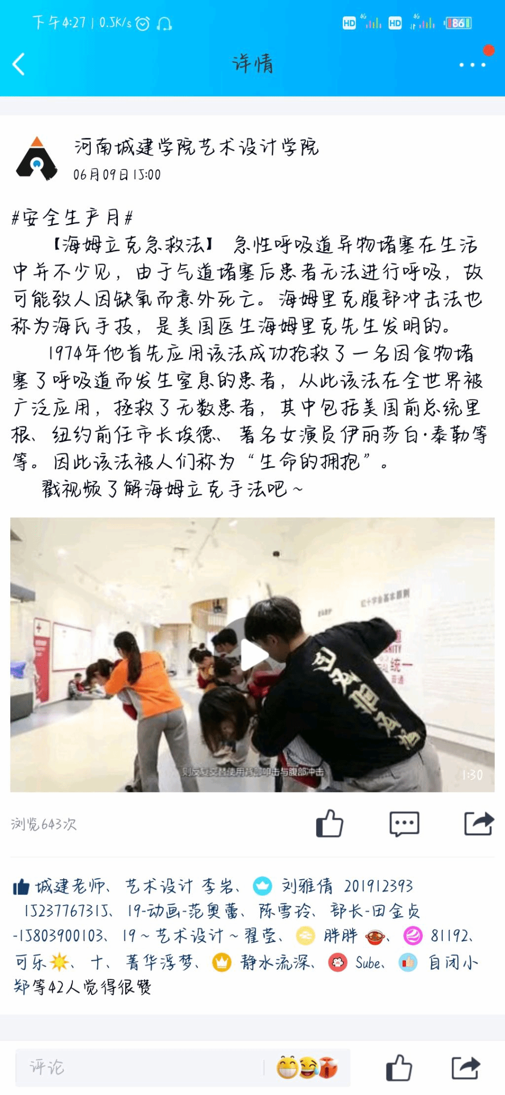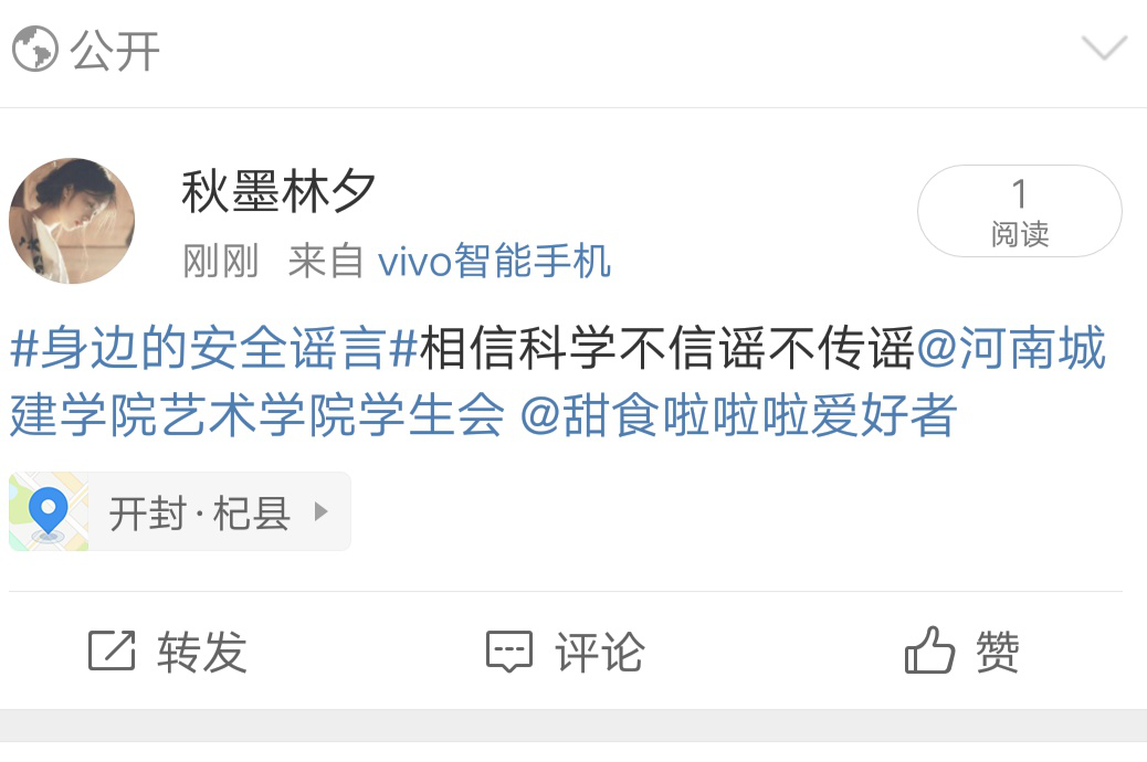 活动过程中,我们用安全体验馆360全景示范展示,急救视频让同学们认识到安全的重要性,通过安全有奖知识竞答活动使同学们可以更直接的学习到一些急救知识,以备不时之需。6.18日的校园安全公开课更是让同学们了解到更多的校园安全问题应该如何应对。然而,身边的安全谣言更应该引起我们的注意,同学们积极转发微博,让更多的人认识到谣言的危险。提醒大家在平时更应该注意安全,不信谣,不传谣。