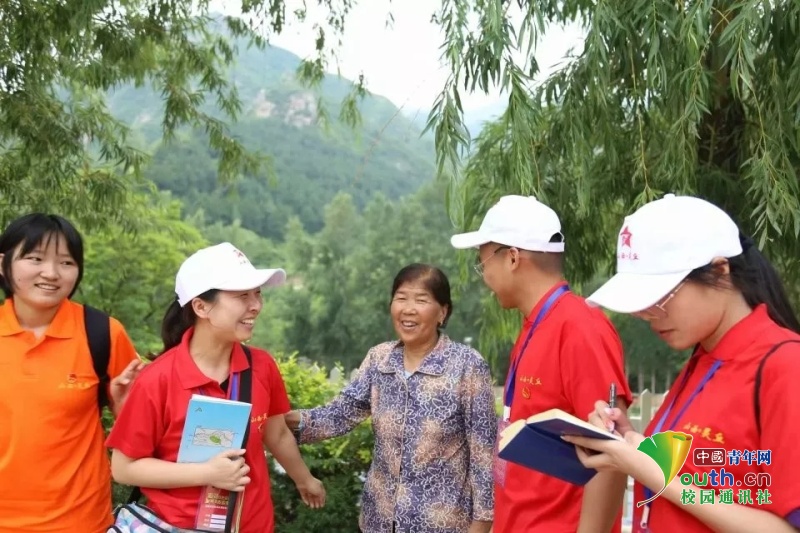 图片为志愿者和村民聊天鼓舞村民一起摆脱贫困。